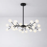 This Modern Branch Style Chandelier with Glass Globe Shades features a semi flush mounted ceiling design with an open, shadeless structure intended for indoor ceiling installation. Constructed from iron, the fixture extends outward from a central mount with multiple branching arms, creating a structured and balanced ceiling profile.